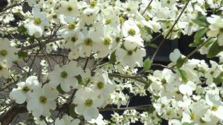 白い花を満開にしたハナミズキ。惜しまれつつも、いまは切り株だけとなってしまった。多くの鳥たちの憩いの場所だった。