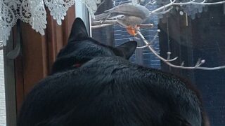 我が家のハナミズキに集う野鳥たちと興奮を隠せないクロネコ・ミーくん
