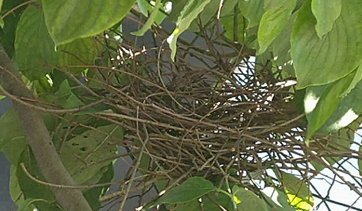 何日も前から、我が家のクロネコ・ミーが騒いでいた。どうも落ち着かないようで、ベランダに出たり、出窓のガラスに顔を寄せたり、とにかく外が気になって仕方ないような様子だ。我が家のハナミズキに2羽のキジバトが巣作りを始めていたのだ。鳥大好きなミーが落ち着かないのも納得できる。しかし、こんな場所にと言うのが第一印象だった。