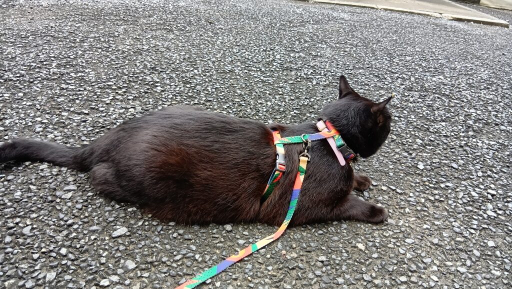 そんなビビりなクロネコ・ミーだが、散歩するのが大好きである。朝と夕方にキッチンのドアの前に陣取り、主を呼んで、今か今かと散歩待ちをする。犬と違って猫の飼育での最大のメリットは、猫は散歩がいらないこと。この散歩の有無によって、人間の生活は大きく異なってくる。一戸建てならともかく、共同住宅だと散歩に出かけるのが一苦労。それに、毎日、決まった時間に準備が必要で、時間が取られてしまう。その最大のメリットが無いのは、猫を飼っている意味がないのでは。ただ本人が望んでいるならば従うしかないのが悲しい現実。と言っても、敷地内の駐車スペースから出ることはなく、クルマの前で猫得意の香箱座りをして、動かない時間がほとんど。ジッと前方を見る姿勢で、行動を眺めている姿は、世間を見せているようではあるが、人の気配を感じると脱兎のごとく逃げ出す。その時の目にも止まらぬ俊敏さで、ハーネスから一瞬で抜けてしまうことも。ある一部の製品しか役に立ちませんでした。