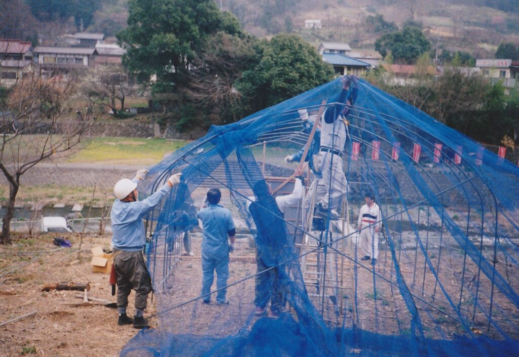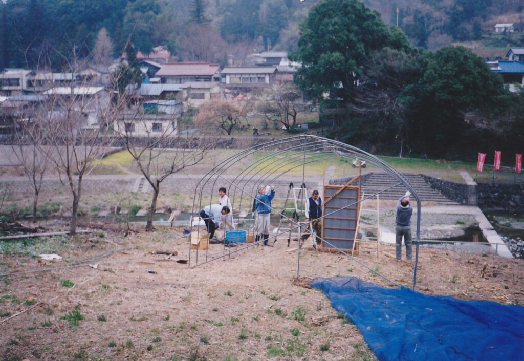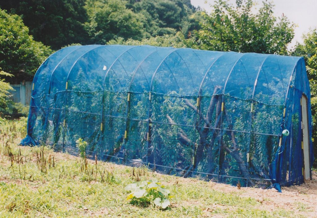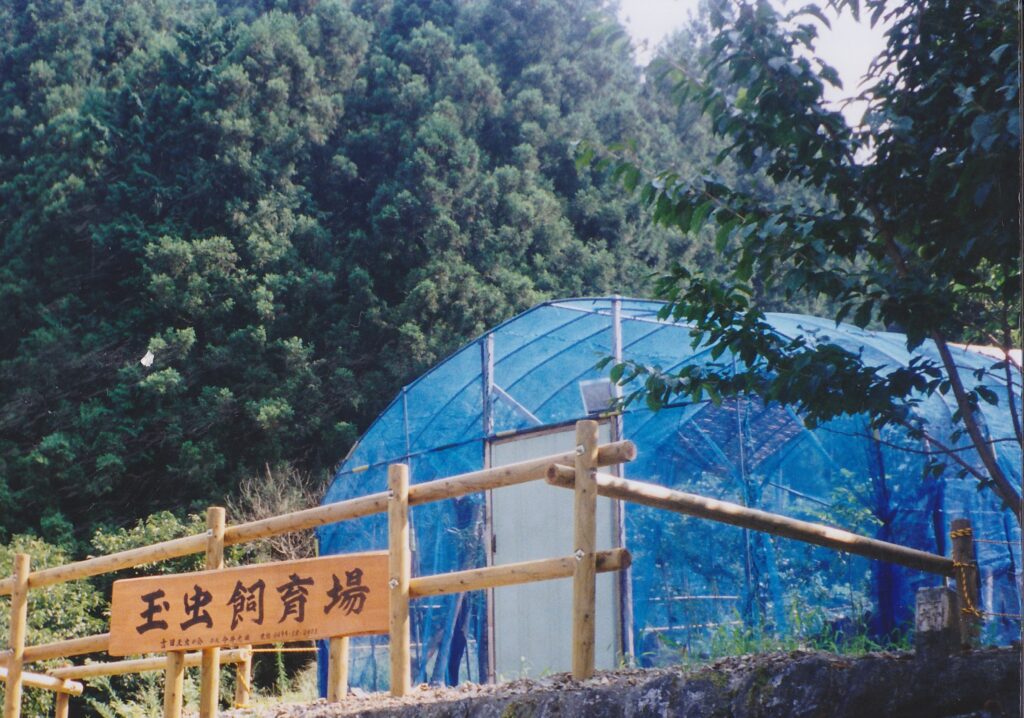 最初の飼育施設は中型のビニールハウスほどの大きさ。玉虫飼育場は今宵荘の裏を流れる川の土手に建てられた。すべてホームセンターで材料を揃え、手作りで建てた。見よう見まねだが、根気の要る仕事。タマムシの飼育だけではなく、繁殖・生態などの観察・研究も行われた。