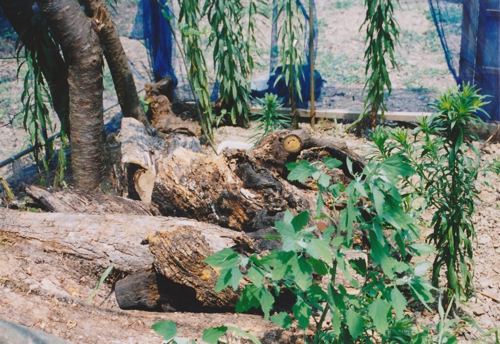 大人の昆虫採集最初の飼育施設は中型のビニールハウスほどの大きさ。玉虫飼育場は今宵荘の裏を流れる川の土手に建てられた。すべてホームセンターで材料を揃え、手作りで建てた。見よう見まねだが、根気の要る仕事。タマムシの飼育だけではなく、繁殖・生態などの観察・研究も行われた。