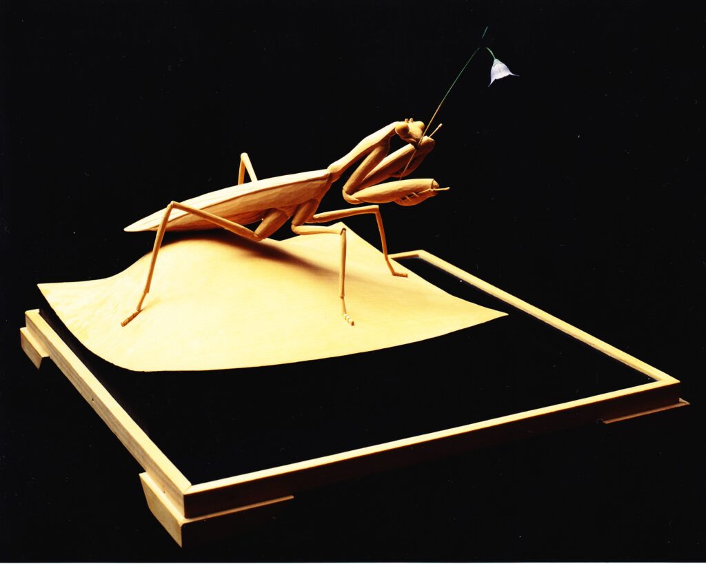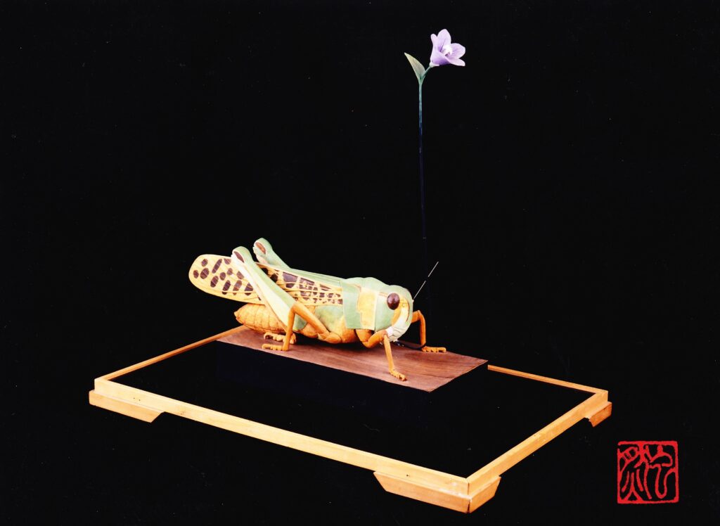 京都から帰ってきて最初に彫ったのは十一面観音だった。、全長1メートル25センチある仏像は、地元の新聞社の記事を見たそば屋の主人から依頼されたものだった。他にも習得してきた寄木造りを存分に生かし仏像を数点、近くの寺院へも納める。しかし、仏を彫るには多くの規律(ルール)を守らなければならない。元来、遊び心を持った型破りな仏師である虫然氏。昆虫博物館は頓挫していたが、すぐに大好きな昆虫や鳥の制作に取り掛かる。依頼されていたものではないので、それが売れるかなどとは頭の片隅にもなかったはず。ただ、巨大アリが完成したときの感情はそれまで味わったことのなかった満足感と達成感だった。また、それが雑誌でも取り上げられ、自分の好きなものを作ることを第一とするようになる。巨大アリに続く、巨大昆虫シリーズに取り組むことになる。わたしが実際に見れたのは、「カマキリ」「ショウリョウバッタ」「トノサマバッタ」程度だが、その造形のリアリティさは荘厳でさえある。やはり、仏像彫刻の感性のなせる業なのだろう。また、殆どの作品が左右対称ではないことが、その昆虫を生き生きとさせている。まさに襲い掛かりそうなカマキリ、一歩踏み出そうとするバッタ、その躍動感も見事である。