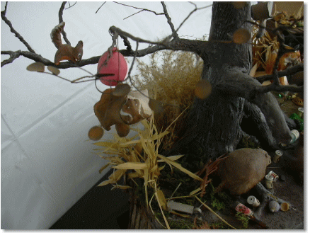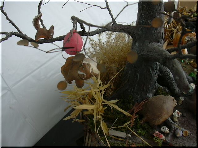 森の中から参加しようと飛んできたムササビが風船に絡まってしまう。助けようとしているのはリス。 |