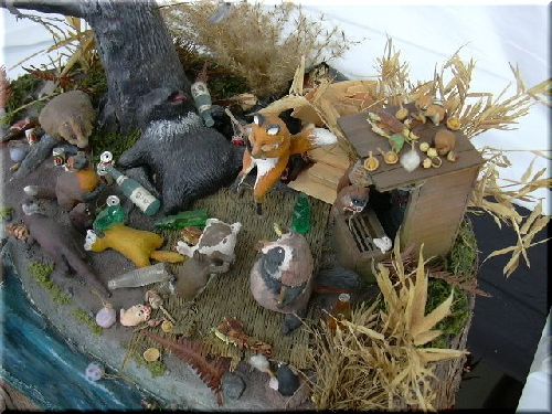 酔いつぶれてトラになったツキノワグマ、アナグマ、賽銭を狙うイタチとオコジョ、