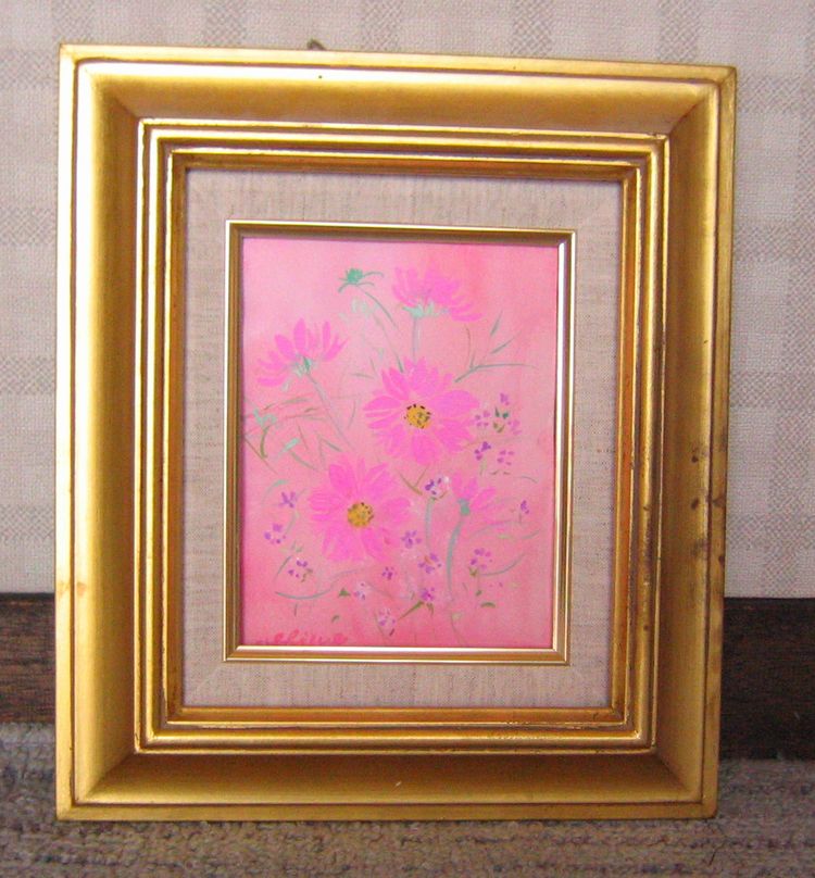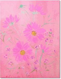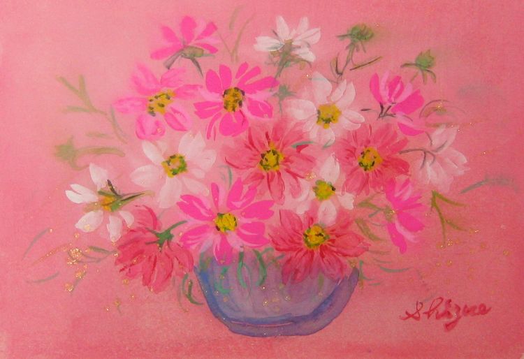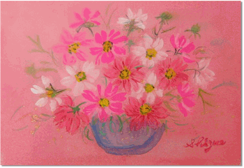 このコスモスは他の作品よりも小さな台紙に描いています。部屋にちょっこと飾ると可愛いです。 |