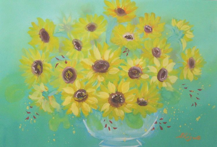 夏の定番ヒマワリも淡い美しさが味わえますバックの緑が涼しげです。 |